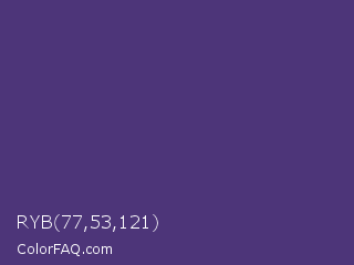 RYB 77,53,121 Color is a normal violet color and the nearest color is Regalia #522d80. Hex code #4d3579 and RGB value is rgb(77,53,121). In RGB color space, this color is composed of 30% red, 21% green, 47% blue, In CMYK color space, this color is composed of 36% cyan, 56% magenta, 0% yellow , 53% black , In HSL color space, this color has a hue angle of 261° , 39% saturation and 34% lightness.