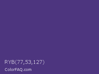 RYB 77,53,127 Color is a normal indigo color and the nearest color is Regalia #522d80. Hex code #4d357f and RGB value is rgb(77,53,127). In RGB color space, this color is composed of 30% red, 21% green, 50% blue, In CMYK color space, this color is composed of 39% cyan, 58% magenta, 0% yellow , 50% black , In HSL color space, this color has a hue angle of 259° , 41% saturation and 35% lightness.
