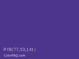 RYB 77,53,141 Color is a normal indigo color and the nearest color is Blue Magenta Violet #553592. Hex code #4d358d and RGB value is rgb(77,53,141). In RGB color space, this color is composed of 30% red, 21% green, 55% blue, In CMYK color space, this color is composed of 45% cyan, 62% magenta, 0% yellow , 45% black , In HSL color space, this color has a hue angle of 256° , 45% saturation and 38% lightness.