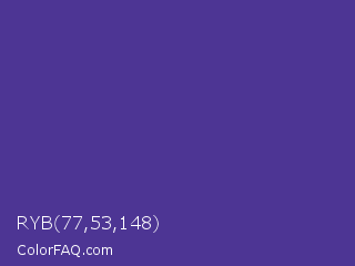 RYB 77,53,148 Color is a normal indigo color and the nearest color is Blue Magenta Violet #553592. Hex code #4d3594 and RGB value is rgb(77,53,148). In RGB color space, this color is composed of 30% red, 21% green, 58% blue, In CMYK color space, this color is composed of 48% cyan, 64% magenta, 0% yellow , 42% black , In HSL color space, this color has a hue angle of 255° , 47% saturation and 39% lightness.
