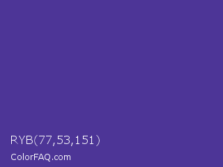 RYB 77,53,151 Color is a normal indigo color and the nearest color is Gigas #523c94. Hex code #4d3597 and RGB value is rgb(77,53,151). In RGB color space, this color is composed of 30% red, 21% green, 59% blue, In CMYK color space, this color is composed of 49% cyan, 65% magenta, 0% yellow , 41% black , In HSL color space, this color has a hue angle of 255° , 48% saturation and 40% lightness.