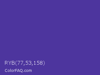 RYB 77,53,158 Color is a normal indigo color and the nearest color is Gigas #523c94. Hex code #4d359e and RGB value is rgb(77,53,158). In RGB color space, this color is composed of 30% red, 21% green, 62% blue, In CMYK color space, this color is composed of 51% cyan, 66% magenta, 0% yellow , 38% black , In HSL color space, this color has a hue angle of 254° , 50% saturation and 41% lightness.