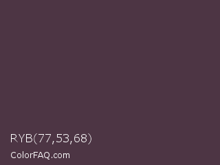RYB 77,53,68 Color is a dark magenta color and the nearest color is Matterhorn #4e3b41. Hex code #4d3544 and RGB value is rgb(77,53,68). In RGB color space, this color is composed of 30% red, 21% green, 27% blue, In CMYK color space, this color is composed of 0% cyan, 31% magenta, 12% yellow , 70% black , In HSL color space, this color has a hue angle of 323° , 18% saturation and 25% lightness.