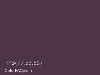 RYB 77,53,69 Color is a dark magenta color and the nearest color is Matterhorn #4e3b41. Hex code #4d3545 and RGB value is rgb(77,53,69). In RGB color space, this color is composed of 30% red, 21% green, 27% blue, In CMYK color space, this color is composed of 0% cyan, 31% magenta, 10% yellow , 70% black , In HSL color space, this color has a hue angle of 320° , 18% saturation and 25% lightness.