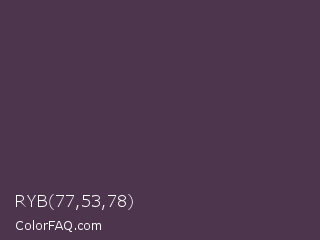 RYB 77,53,78 Color is a dark magenta color and the nearest color is Voodoo #533455. Hex code #4d354e and RGB value is rgb(77,53,78). In RGB color space, this color is composed of 30% red, 21% green, 31% blue, In CMYK color space, this color is composed of 1% cyan, 32% magenta, 0% yellow , 69% black , In HSL color space, this color has a hue angle of 298° , 19% saturation and 26% lightness.