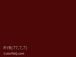 RYB 77,7,7 Color is a very dark red color and the nearest color is Mahogany #4e0606. Hex code #4d0707 and RGB value is rgb(77,7,7). In RGB color space, this color is composed of 30% red, 3% green, 3% blue, In CMYK color space, this color is composed of 0% cyan, 91% magenta, 91% yellow , 70% black , In HSL color space, this color has a hue angle of 0° , 83% saturation and 16% lightness.