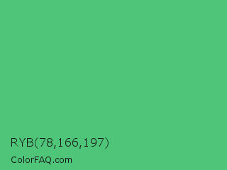RYB 78,166,197 Color is a normal green color and the nearest color is Emerald #50c878. Hex code #4ec578 and RGB value is rgb(78,197,120). In RGB color space, this color is composed of 31% red, 77% green, 47% blue, In CMYK color space, this color is composed of 60% cyan, 0% magenta, 39% yellow , 23% black , In HSL color space, this color has a hue angle of 141° , 51% saturation and 54% lightness.