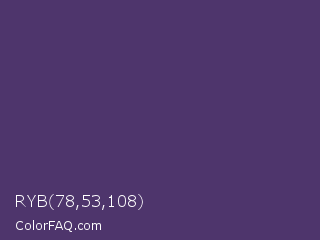 RYB 78,53,108 Color is a normal violet color and the nearest color is Mulled Wine #4e4562. Hex code #4e356c and RGB value is rgb(78,53,108). In RGB color space, this color is composed of 31% red, 21% green, 42% blue, In CMYK color space, this color is composed of 28% cyan, 51% magenta, 0% yellow , 58% black , In HSL color space, this color has a hue angle of 267° , 34% saturation and 32% lightness.