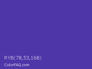 RYB 78,53,168 Color is a normal indigo color and the nearest color is Ocean Blue #4f42b5. Hex code #4e35a8 and RGB value is rgb(78,53,168). In RGB color space, this color is composed of 31% red, 21% green, 66% blue, In CMYK color space, this color is composed of 54% cyan, 68% magenta, 0% yellow , 34% black , In HSL color space, this color has a hue angle of 253° , 52% saturation and 43% lightness.