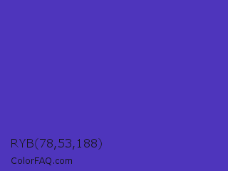 RYB 78,53,188 Color is a normal indigo color and the nearest color is Ocean Blue #4f42b5. Hex code #4e35bc and RGB value is rgb(78,53,188). In RGB color space, this color is composed of 31% red, 21% green, 74% blue, In CMYK color space, this color is composed of 59% cyan, 72% magenta, 0% yellow , 26% black , In HSL color space, this color has a hue angle of 251° , 56% saturation and 47% lightness.