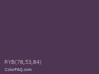 RYB 78,53,84 Color is a dark purple color and the nearest color is Voodoo #533455. Hex code #4e3554 and RGB value is rgb(78,53,84). In RGB color space, this color is composed of 31% red, 21% green, 33% blue, In CMYK color space, this color is composed of 7% cyan, 37% magenta, 0% yellow , 67% black , In HSL color space, this color has a hue angle of 288° , 23% saturation and 27% lightness.