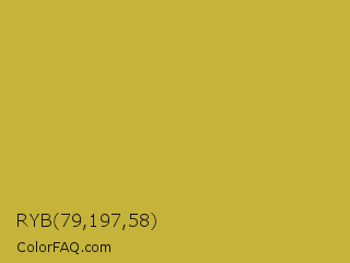 RYB 79,197,58 Color is a normal yellow color and the nearest color is Earls Green #c9b93b. Hex code #c5b33a and RGB value is rgb(197,179,58). In RGB color space, this color is composed of 77% red, 70% green, 23% blue, In CMYK color space, this color is composed of 0% cyan, 9% magenta, 71% yellow , 23% black , In HSL color space, this color has a hue angle of 52° , 55% saturation and 50% lightness.