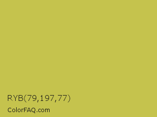 RYB 79,197,77 Color is a normal yellow color and the nearest color is Turmeric #cabb48. Hex code #c5c34d and RGB value is rgb(197,195,77). In RGB color space, this color is composed of 77% red, 76% green, 30% blue, In CMYK color space, this color is composed of 0% cyan, 1% magenta, 61% yellow , 23% black , In HSL color space, this color has a hue angle of 59° , 51% saturation and 54% lightness.
