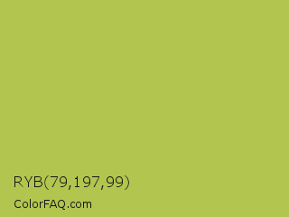 RYB 79,197,99 Color is a normal yellow color and the nearest color is Celery #b8c25d. Hex code #b1c54f and RGB value is rgb(177,197,79). In RGB color space, this color is composed of 69% red, 77% green, 31% blue, In CMYK color space, this color is composed of 10% cyan, 0% magenta, 60% yellow , 23% black , In HSL color space, this color has a hue angle of 70° , 50% saturation and 54% lightness.