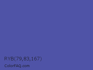 RYB 79,83,167 Color is a normal blue color and the nearest color is Liberty #545aa7. Hex code #4f53a7 and RGB value is rgb(79,83,167). In RGB color space, this color is composed of 31% red, 33% green, 65% blue, In CMYK color space, this color is composed of 53% cyan, 50% magenta, 0% yellow , 35% black , In HSL color space, this color has a hue angle of 237° , 36% saturation and 48% lightness.
