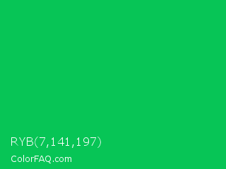 RYB 7,141,197 Color is a normal green color and the nearest color is Malachite #0bda51. Hex code #07c556 and RGB value is rgb(7,197,86). In RGB color space, this color is composed of 3% red, 77% green, 34% blue, In CMYK color space, this color is composed of 96% cyan, 0% magenta, 56% yellow , 23% black , In HSL color space, this color has a hue angle of 145° , 93% saturation and 40% lightness.