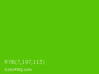 RYB 7,197,115 Color is a normal green color and the nearest color is Kelly Green #4cbb17. Hex code #59c507 and RGB value is rgb(89,197,7). In RGB color space, this color is composed of 35% red, 77% green, 3% blue, In CMYK color space, this color is composed of 55% cyan, 0% magenta, 96% yellow , 23% black , In HSL color space, this color has a hue angle of 94° , 93% saturation and 40% lightness.