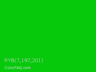 RYB 7,197,201 Color is a normal green color and the nearest color is Vivid Malachite #00cc33. Hex code #07c90b and RGB value is rgb(7,201,11). In RGB color space, this color is composed of 3% red, 79% green, 4% blue, In CMYK color space, this color is composed of 97% cyan, 0% magenta, 95% yellow , 21% black , In HSL color space, this color has a hue angle of 121° , 93% saturation and 41% lightness.