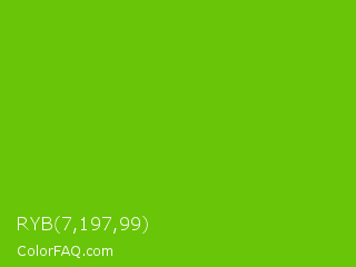 RYB 7,197,99 Color is a normal green color and the nearest color is Lima #76bd17. Hex code #69c507 and RGB value is rgb(105,197,7). In RGB color space, this color is composed of 41% red, 77% green, 3% blue, In CMYK color space, this color is composed of 47% cyan, 0% magenta, 96% yellow , 23% black , In HSL color space, this color has a hue angle of 89° , 93% saturation and 40% lightness.