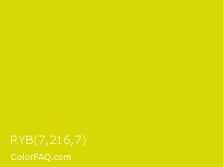RYB 7,216,7 Color is a normal yellow color and the nearest color is Citrine #e4d00a. Hex code #d8d807 and RGB value is rgb(216,216,7). In RGB color space, this color is composed of 85% red, 85% green, 3% blue, In CMYK color space, this color is composed of 0% cyan, 0% magenta, 97% yellow , 15% black , In HSL color space, this color has a hue angle of 60° , 94% saturation and 44% lightness.