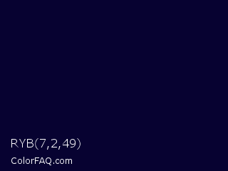 RYB 7,2,49 Color is a very dark indigo color and the nearest color is Black Rock #0d0332. Hex code #070231 and RGB value is rgb(7,2,49). In RGB color space, this color is composed of 3% red, 1% green, 19% blue, In CMYK color space, this color is composed of 86% cyan, 96% magenta, 0% yellow , 81% black , In HSL color space, this color has a hue angle of 246° , 92% saturation and 10% lightness.