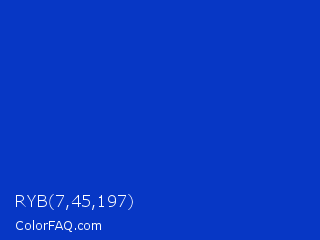 RYB 7,45,197 Color is a normal blue color and the nearest color is Absolute Zero #0048ba. Hex code #0737c5 and RGB value is rgb(7,55,197). In RGB color space, this color is composed of 3% red, 22% green, 77% blue, In CMYK color space, this color is composed of 96% cyan, 72% magenta, 0% yellow , 23% black , In HSL color space, this color has a hue angle of 225° , 93% saturation and 40% lightness.