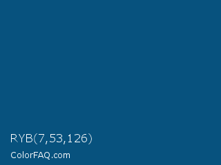 RYB 7,53,126 Color is a dark blue color and the nearest color is Dark Cerulean #08457e. Hex code #07527e and RGB value is rgb(7,82,126). In RGB color space, this color is composed of 3% red, 32% green, 49% blue, In CMYK color space, this color is composed of 94% cyan, 35% magenta, 0% yellow , 51% black , In HSL color space, this color has a hue angle of 202° , 89% saturation and 26% lightness.