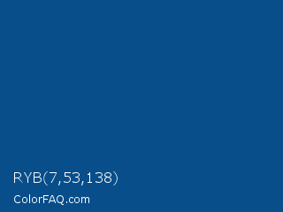 RYB 7,53,138 Color is a dark blue color and the nearest color is Congress Blue #02478e. Hex code #074e8a and RGB value is rgb(7,78,138). In RGB color space, this color is composed of 3% red, 31% green, 54% blue, In CMYK color space, this color is composed of 95% cyan, 43% magenta, 0% yellow , 46% black , In HSL color space, this color has a hue angle of 207° , 90% saturation and 28% lightness.