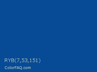 RYB 7,53,151 Color is a normal blue color and the nearest color is Medium Electric Blue #035096. Hex code #074b97 and RGB value is rgb(7,75,151). In RGB color space, this color is composed of 3% red, 29% green, 59% blue, In CMYK color space, this color is composed of 95% cyan, 50% magenta, 0% yellow , 41% black , In HSL color space, this color has a hue angle of 212° , 91% saturation and 31% lightness.