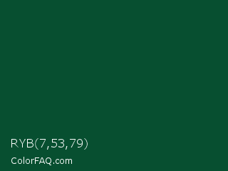 RYB 7,53,79 Color is a very dark green color and the nearest color is Sherwood Green #02402c. Hex code #074f30 and RGB value is rgb(7,79,48). In RGB color space, this color is composed of 3% red, 31% green, 19% blue, In CMYK color space, this color is composed of 91% cyan, 0% magenta, 39% yellow , 69% black , In HSL color space, this color has a hue angle of 154° , 84% saturation and 17% lightness.