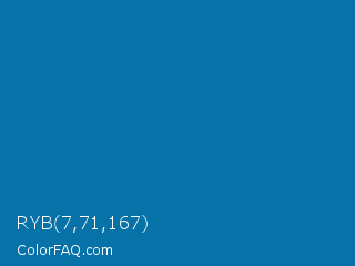 RYB 7,71,167 Color is a normal blue color and the nearest color is Allports #0076a3. Hex code #0772a7 and RGB value is rgb(7,114,167). In RGB color space, this color is composed of 3% red, 45% green, 65% blue, In CMYK color space, this color is composed of 96% cyan, 32% magenta, 0% yellow , 35% black , In HSL color space, this color has a hue angle of 200° , 92% saturation and 34% lightness.
