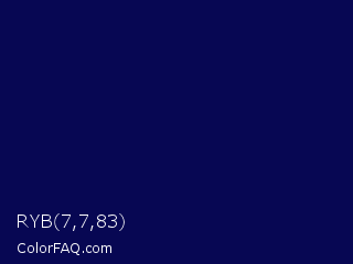 RYB 7,7,83 Color is a very dark blue color and the nearest color is Gulf Blue #051657. Hex code #070753 and RGB value is rgb(7,7,83). In RGB color space, this color is composed of 3% red, 3% green, 33% blue, In CMYK color space, this color is composed of 92% cyan, 92% magenta, 0% yellow , 67% black , In HSL color space, this color has a hue angle of 240° , 84% saturation and 18% lightness.