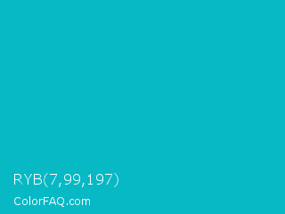 RYB 7,99,197 Color is a normal cyan color and the nearest color is Turquoise Surf #00c5cd. Hex code #07b9c5 and RGB value is rgb(7,185,197). In RGB color space, this color is composed of 3% red, 73% green, 77% blue, In CMYK color space, this color is composed of 96% cyan, 6% magenta, 0% yellow , 23% black , In HSL color space, this color has a hue angle of 184° , 93% saturation and 40% lightness.