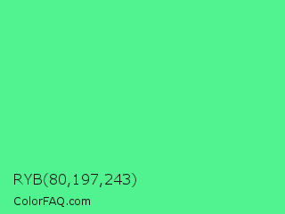 RYB 80,197,243 Color is a light green color and the nearest color is Very Light Malachite Green #64e986. Hex code #50f390 and RGB value is rgb(80,243,144). In RGB color space, this color is composed of 31% red, 95% green, 56% blue, In CMYK color space, this color is composed of 67% cyan, 0% magenta, 41% yellow , 5% black , In HSL color space, this color has a hue angle of 144° , 87% saturation and 63% lightness.