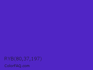 RYB 80,37,197 Color is a normal indigo color and the nearest color is Purple Heart Crayola #652dc1. Hex code #5025c5 and RGB value is rgb(80,37,197). In RGB color space, this color is composed of 31% red, 15% green, 77% blue, In CMYK color space, this color is composed of 59% cyan, 81% magenta, 0% yellow , 23% black , In HSL color space, this color has a hue angle of 256° , 68% saturation and 46% lightness.