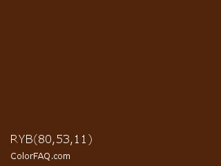 RYB 80,53,11 Color is a very dark orange color and the nearest color is Cioccolato #55280c. Hex code #50250b and RGB value is rgb(80,37,11). In RGB color space, this color is composed of 31% red, 15% green, 4% blue, In CMYK color space, this color is composed of 0% cyan, 54% magenta, 86% yellow , 69% black , In HSL color space, this color has a hue angle of 23° , 76% saturation and 18% lightness.