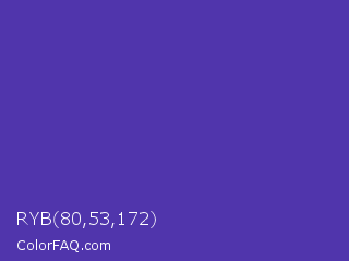RYB 80,53,172 Color is a normal indigo color and the nearest color is Ocean Blue #4f42b5. Hex code #5035ac and RGB value is rgb(80,53,172). In RGB color space, this color is composed of 31% red, 21% green, 67% blue, In CMYK color space, this color is composed of 53% cyan, 69% magenta, 0% yellow , 33% black , In HSL color space, this color has a hue angle of 254° , 53% saturation and 44% lightness.