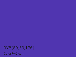 RYB 80,53,176 Color is a normal indigo color and the nearest color is Ocean Blue #4f42b5. Hex code #5035b0 and RGB value is rgb(80,53,176). In RGB color space, this color is composed of 31% red, 21% green, 69% blue, In CMYK color space, this color is composed of 55% cyan, 70% magenta, 0% yellow , 31% black , In HSL color space, this color has a hue angle of 253° , 54% saturation and 45% lightness.