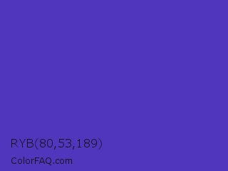 RYB 80,53,189 Color is a normal indigo color and the nearest color is Ocean Blue #4f42b5. Hex code #5035bd and RGB value is rgb(80,53,189). In RGB color space, this color is composed of 31% red, 21% green, 74% blue, In CMYK color space, this color is composed of 58% cyan, 72% magenta, 0% yellow , 26% black , In HSL color space, this color has a hue angle of 252° , 56% saturation and 47% lightness.