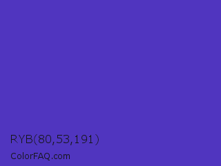 RYB 80,53,191 Color is a normal indigo color and the nearest color is Ocean Blue #4f42b5. Hex code #5035bf and RGB value is rgb(80,53,191). In RGB color space, this color is composed of 31% red, 21% green, 75% blue, In CMYK color space, this color is composed of 58% cyan, 72% magenta, 0% yellow , 25% black , In HSL color space, this color has a hue angle of 252° , 57% saturation and 48% lightness.