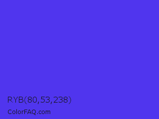 RYB 80,53,238 Color is a normal indigo color and the nearest color is Han Purple #5218fa. Hex code #5035ee and RGB value is rgb(80,53,238). In RGB color space, this color is composed of 31% red, 21% green, 93% blue, In CMYK color space, this color is composed of 66% cyan, 78% magenta, 0% yellow , 7% black , In HSL color space, this color has a hue angle of 249° , 84% saturation and 57% lightness.