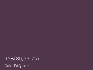 RYB 80,53,75 Color is a dark magenta color and the nearest color is Voodoo #533455. Hex code #50354b and RGB value is rgb(80,53,75). In RGB color space, this color is composed of 31% red, 21% green, 29% blue, In CMYK color space, this color is composed of 0% cyan, 34% magenta, 6% yellow , 69% black , In HSL color space, this color has a hue angle of 311° , 20% saturation and 26% lightness.