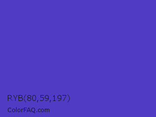 RYB 80,59,197 Color is a normal indigo color and the nearest color is Ocean Blue #4f42b5. Hex code #503bc5 and RGB value is rgb(80,59,197). In RGB color space, this color is composed of 31% red, 23% green, 77% blue, In CMYK color space, this color is composed of 59% cyan, 70% magenta, 0% yellow , 23% black , In HSL color space, this color has a hue angle of 249° , 54% saturation and 50% lightness.