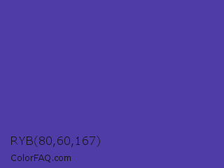 RYB 80,60,167 Color is a normal indigo color and the nearest color is Ocean Blue #4f42b5. Hex code #503ca7 and RGB value is rgb(80,60,167). In RGB color space, this color is composed of 31% red, 24% green, 65% blue, In CMYK color space, this color is composed of 52% cyan, 64% magenta, 0% yellow , 35% black , In HSL color space, this color has a hue angle of 251° , 47% saturation and 45% lightness.