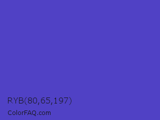 RYB 80,65,197 Color is a normal indigo color and the nearest color is Ocean Blue #4f42b5. Hex code #5041c5 and RGB value is rgb(80,65,197). In RGB color space, this color is composed of 31% red, 25% green, 77% blue, In CMYK color space, this color is composed of 59% cyan, 67% magenta, 0% yellow , 23% black , In HSL color space, this color has a hue angle of 247° , 53% saturation and 51% lightness.