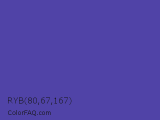 RYB 80,67,167 Color is a normal indigo color and the nearest color is Ocean Blue #4f42b5. Hex code #5043a7 and RGB value is rgb(80,67,167). In RGB color space, this color is composed of 31% red, 26% green, 65% blue, In CMYK color space, this color is composed of 52% cyan, 60% magenta, 0% yellow , 35% black , In HSL color space, this color has a hue angle of 248° , 43% saturation and 46% lightness.