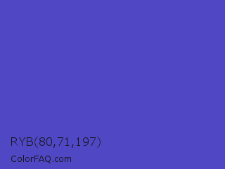 RYB 80,71,197 Color is a normal indigo color and the nearest color is Iris #5a4fcf. Hex code #5047c5 and RGB value is rgb(80,71,197). In RGB color space, this color is composed of 31% red, 28% green, 77% blue, In CMYK color space, this color is composed of 59% cyan, 64% magenta, 0% yellow , 23% black , In HSL color space, this color has a hue angle of 244° , 52% saturation and 53% lightness.