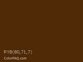 RYB 80,71,7 Color is a very dark orange color and the nearest color is Bracken #4a2a04. Hex code #502907 and RGB value is rgb(80,41,7). In RGB color space, this color is composed of 31% red, 16% green, 3% blue, In CMYK color space, this color is composed of 0% cyan, 49% magenta, 91% yellow , 69% black , In HSL color space, this color has a hue angle of 28° , 84% saturation and 17% lightness.