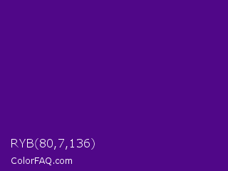 RYB 80,7,136 Color is a dark purple color and the nearest color is Pigment Indigo #4b0082. Hex code #500788 and RGB value is rgb(80,7,136). In RGB color space, this color is composed of 31% red, 3% green, 53% blue, In CMYK color space, this color is composed of 41% cyan, 95% magenta, 0% yellow , 47% black , In HSL color space, this color has a hue angle of 274° , 90% saturation and 28% lightness.