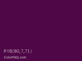 RYB 80,7,71 Color is a very dark magenta color and the nearest color is Loulou #460b41. Hex code #500747 and RGB value is rgb(80,7,71). In RGB color space, this color is composed of 31% red, 3% green, 28% blue, In CMYK color space, this color is composed of 0% cyan, 91% magenta, 11% yellow , 69% black , In HSL color space, this color has a hue angle of 307° , 84% saturation and 17% lightness.